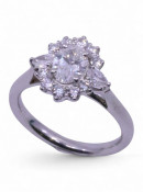 A diamond halo cluster ring set in platinum finger size M 1/2, with a copy of a GIA certificate which states the main diamond is 0.71cts, F colour SI2 clarity