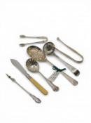 A collection of silver item, including: A silver sugar tongs by Hester Bateman, A silver sugar sifter spoon, silver sugar tongs, total weight approx. 118 grams, and American spoon, an American butter pick (37 grams) and a silver plated spoon & butter knife