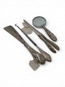 A collection of items including: A silver handled Shoe Horn, Button hook, glove stretcher (92 grams) and magnifying glass