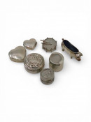 A collection of items including: A silver pig pin cushion, two heart shaped boxes, a silver pill box, a silver coin holder (total weight approx. 62.9 grams) and a white metal circular box and a drum style charm