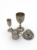 A collection of items including: A Silver goblet, Birm 1930 approx. 60 grams, A smaller silver goblet Birm 1920 approx. 29.3 grams, a silver mustard pot Sheff 1916 approx. 65 grams and a silver ink well (filled)