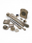 A collection of silver and white metal boxes, a silver photo frame, silver mounted button hooks, shoe horn and white metal parasol handle