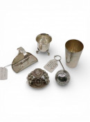 A collection of silver and white metal items including: A silver beaker & salt approx. 97 grams, and an American tea infuser, and basket