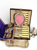 A heart shaped photo frame Birm 1901 and silver plated jug and tray, a boxed set of fish knives with forks and a boxed weighting scales